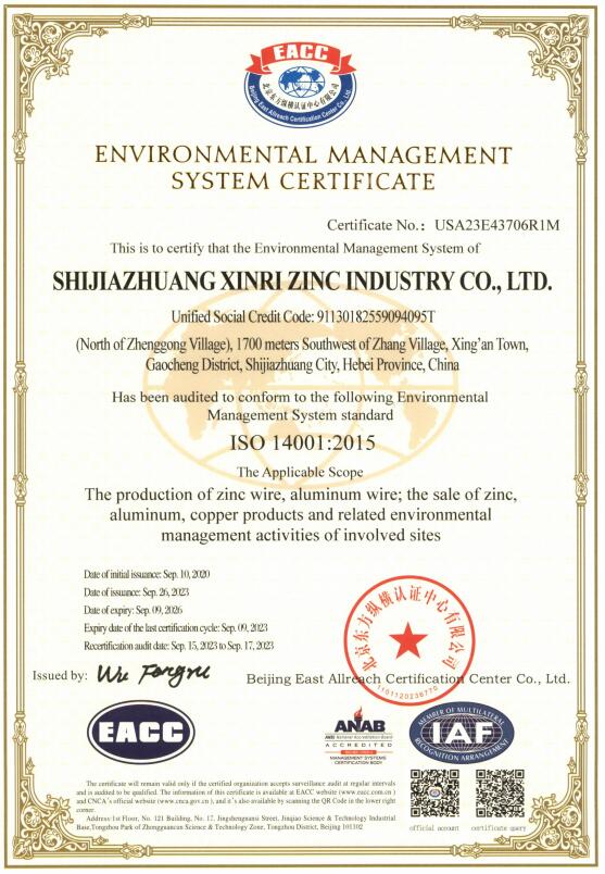 石家庄新日锌业有限公司占地面积30000平方米。本厂视质量为企业的生命,严格执行行业标准和国际标准,生产锌丝、锌铝合金丝、锌球、锌粒、锌板、锌带、锌饼、锌条、锌棒、锌段、锌阳极、锌丸、锌块、铝丝、铝粒、铝丸、铝条等锌、铝制品及锌基合金、锌铝异形材。